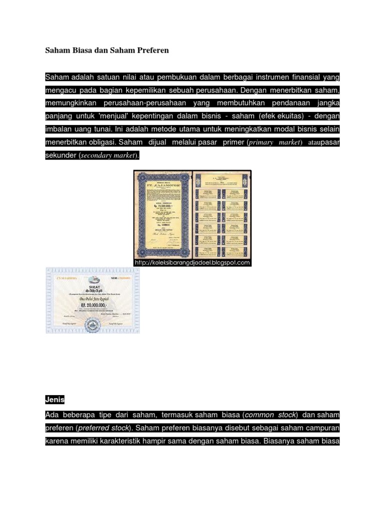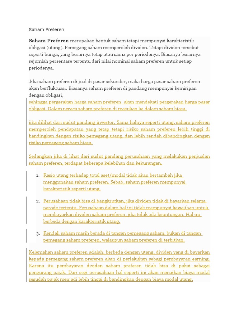 Saham preferen barangkali jarang anda temui. Saham preferen (preferred stock) saham preferen (preferred stock) adalah jenis saham yang mendapat bagian hasil tetap dan mendapat prioritas utama dari hasil penjualan aset kalau perusahaan bangkrut. Sebab, pemilik atau pemegang saham preferen akan memiliki hak hak yang lebih baik menguntungkan daripada hak hak pemegang saham biasa.